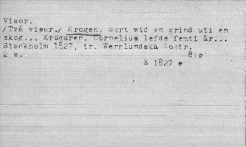 //// Vis or. //// /Två visor./ Krogen. i;ort vid en grind uti en skog... Krögaren. tlornelius Vefde fe^ti ar... //// Storkholm lo27, tr. Werrlundska l o;ct r. 2 s. 8; o //// i l8?7 e ////