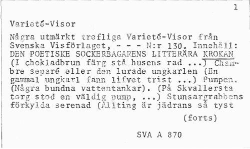 //// T //// X //// Varieté-Visor //// Några utmärkt trsfliga Varieté-Visor från Svenska Visförlaget, - - - N:r 130. Innehåll: DEN POETISKE SOCKERBAGARENS LITTERÄRA KROKAN (I chokladbrun färg stå husens rad .. .1 Cliaa-bre separé eller den lurade ungkarlen (En gammal ungkarl fann li f ve t trist ...) Pumpen,., (Några bundna vattentankar). (På Skvallersta torg stod en väldig pump, ...) Stunsargrabbens förkylda serenad (Allting är jädrans sa tyst //// (forts) //// SVA A 8 70 ////