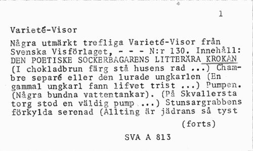 //// 1 //// VarietS-Visor //// Några utmärkt trefliga Varieté-Visor från Svenska Vis förlaget, - - - N:r 130. Innehåll: DEN POETISKE SOCKERBAGARENS LITTERÄRA KROKAN (I chokladbrun färg stå husens rad ...) Chani-bre separé eller den lurade ungkarlen (En gammal*ungkarl fann lifvet trist ...) Pumpen. (Några bundna vattentankar). (På Skvallersta torg stod en väldig pump ...) Stunsargrabbens förkylda serenad (Allting är jädrans så tyst //// (forts) //// SVA A 813 ////