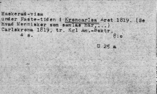 //// Maskerad-vi sa //// under Faste-tider, i Kroncarlea Aret 1819. I Se hvad Men ni sker som samlas' TTSFT...) ' ' ... //// Carlskrona 1819, tr. Am.-Bektr. , //// 4. s. 8:e . . //// U 25 a ////