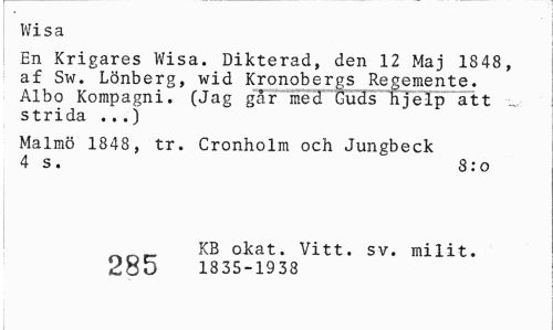 //// Wisa //// En Krigares Wisa. Dikterad, den 12 Maj 1848, af Sw. Lönberg, wid Kronobergs Regemente. Albo Kompagni. (Jag går med Guds hjelp att strida ...) //// Malmö 1848, tr. Cronholm och Jungbeck 4 s. 8:o //// KB okat. Vitt. sv. milit. //// 285 1835-1938 ////