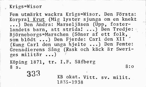 //// Krigs=Wisor //// Fem utmärkt wackra Krigs=Wisor. Den Första: Korpral Krut (Mig lyster sjunga om en knekt ...) Den Andra: Marseljäsen (Upp, fosterlandets barn, att strida! ...) Den Tredje: Björneborgs=Marschen (Söner af ett folk, som blödt ...) Den Fjerde: Carl den XII (Kung Carl den unga hjelte —) Den Femte: Grenadierens Sång (Kask och käck är Sweriges militär ...) ' //// Köping 1871, tr. I.F. Säfberg 8 s. 8:0 //// KB okat. Vitt. sv. milit. //// 1835-1938 ////