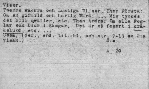 //// Visor. //// Twenne wackra och Lustiga VTijsor, Ther Första: Om en gif&iU och hurtig Wärd : ... Mig tyckes det blir qwäller, etc. Then Andra: Om alla Fog-lar ech Diur i Skogar, Det är så fagert i kra- //// Kelund etc . ... —-. //// Jöoa,~*(def., end . ti t.-bl. och str. 7-13 av 2; a //// visan.) 3;o " //// 1 A 20 ////