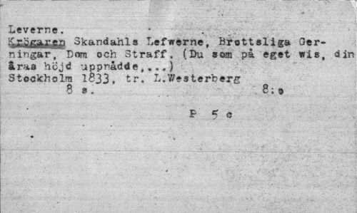 //// Leverne. • • . //// K, ragar eg Skandahls Lefirerne, Brottsliga Ger- //// ningår** Dom och Straff. (Du som på eget wis, din //// åras höjd uppnådde,...) //// Stockholm 1833, tr. L.Westerberg //// 8 s. 8:9 //// P 5 c ////