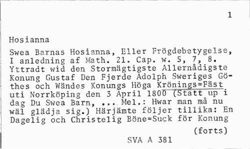 //// 1 //// Hosianna //// Swea Barnas Hosianna, Eller Frögdebetygelse, I anledning af Math. 21. Cap. w. S, 7, 8. Yttradt wid den Stormägtigste Allernådigste Konung Gustaf Den Fjerde Adolph Sweriges Gö-thes och Wändes Konungs Höga Krönings=Fäst uti Norrköping den 3 April 1800 (Statt up i dag Du Swea Barn, ... Mel.: Hwar man må nu wäl glädja sig.) Härjämte följer tillika: En Dagelig och Christelig Böne=Suck för Konung //// (forts) //// SVA A 381 ////