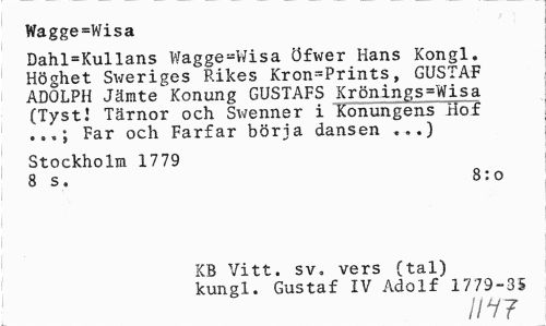//// Wagge=Wisa //// Dahl=Kullans Wagge=Wisa öfwer Hans Kongl. Höghet Sweriges Rikes Kron=Prints, GUSTAF ADOLPH Jämte Konung GUSTAFS Krönings-Wisa (Tyst! Tärnor och Swenner i Konungens Hof Far och Farfar börja dansen ...) //// Stockholm 1779 //// 8 s. 8:0 //// KB Vitt. sv. vers (tal) kung1. Gustaf IV Adolf 1779-35 //// //77 ////