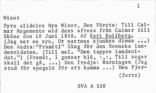 //// 1 //// Wisor //// Fyra alldeles Nya Wisor, Den Första: Till Cal-mar Regemente wid dess afresa från Calmar till Skåne den 10 Juni 1848. Af Karl Kullberg. ><s, (Jag ser en syn. Ur nattens sjunkna dimma ...) Den Ändra:"Framåt]" Sång för den Swenska landesoldaten. (Till mel. "Den tappre landsoldat.") (Framåt, I gossar blå, :,:, Till seger skall det gå, ...) Den Tredje: Warningen (Jag stod för spegeln för att kamma ...) Den Fjer- //// (forts) //// SVA A 550 ////