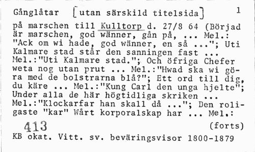 //// Gånglåtar [utan särskild titelsida^ 1 //// på marschen till Kulltorp d. 27/3 64 (Börjad är marschen, god wänner, gån på, ... Mel.: "Ack om wi hade, god wänner, en så Uti //// Kalmare stad står den sanningen fast ... Mel.:"Uti Kalmare stad."; Och öfriga Chefer weta nog utan prut ... Mel.:"Hwad ska wi göra med de bolstrarna blå?"; Ett ord till dig, du käre ... Mel.:"Kung Carl den unga hjelte"; Under alla de här högtidliga skriken ... Mel.:"Klockarfar han skall då ..."; Den roligaste "kar" Wårt korporalskap har ... Mel,: //// 413 (forts) //// KB okat. Vitt. sv. beväringsvisor 1800-1879 ////