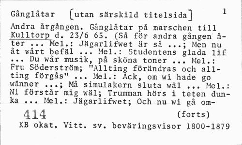 //// Gånglåtar |[utan särskild titelsida]) //// Andra årgången. Gånglåtar på marschen till Kulltorp d. 23/6 65. (Så för andra gången å-ter ... Mel.: Jägarlifwet är så ...; Men nu åt vårt befäl ... Mel.: Studentens glada lif ... Du wår musik, på sköna toner ... Mel.: Fru Söderström; "Allting förändras och allting förgås" ... Mel.: Ack, om wi hade go wänner ...; Må simulakern sluta wäl Mel.: Ni förstår mig wäl; Trumman hörs i teten dunka ... Mel.: Jägarlifwet; Och nu wi gå om- //// 414 (forts) //// KB okat. Vitt. sv. beväringsvisor 1800-1879 ////