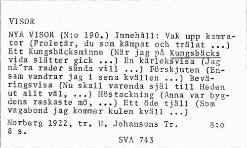 //// VISOR //// NYA VISOR (N:o 190.) Innehåll: Vak upp kamrater (Proletär, du som kämpat och trälat ...) Ett Kungsbäcksminne (När jag på Kungsbäcks vida slätter gick ...) En kärleksvisa (Jag nå"ra rader sända vill ...) Förskjuten (Ensam vandrar jag i sena kvällen ...) Bevä-ringsvisa (Nu skall varenda själ till Heden ut allt väl, ...) Höstackning (Anna var bygdens raskaste mö, ...) Ett öde tjäll (Som vagabond jag kommer kulen kväll ...) //// Norberg 1922, tr. U. Johansons Tr. 8:0 //// 8 s. //// SVA 743 ////