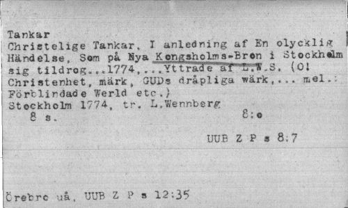 //// Tankar //// Christelige Tankar, I anledning af En olycklig Händelse, Som på Hy a K ongsho 1m s -B r on i Stockhébn 'sig tildrog. ..1774, . .. Yt t rade""*f"1!T». 3, (OJ Christenhet, märk, GUDs dråpliga wärk , . .. mel-.; Förblindade Werld etc.) Stockholm 1774, tr. L.Wennberg //// 8 s. 6;o //// j UUB Z P a 8,7 //// Crebrc uå, UUB Z P a 12;35 ////