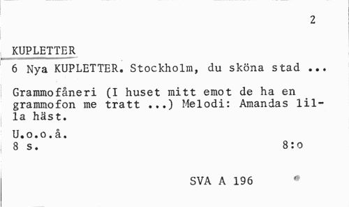 //// 2 //// KUPLETTER //// 6 Nya KUPLETTER. Stockholm, du sköna stad ... //// Grammofåneri (I huset mitt emot de ha en grammofon me tratt ...) Melodi: Amandas lilla häst. //// U.o.o.å. //// 8 s. 8:o //// SVA A 196 * ////
