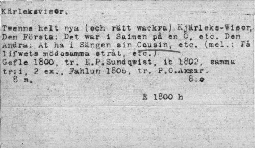 //// Kärlekevi s®r. , --- --- //// Twenne helt nya (och rätt wackra) K.järleks~f le or. Den Första; Det war i Saimen på en C, etc. Den Andra, At ha i Sängen sin Cousin, etc. (mel.: Få lifwets mödosamma stråt, etc.) Gefle 1800, tr. Jfi.P,Sundqwist, ib 1802, samma t r: i ( 2 ex., Fahlun l806, tr. P.O.Äxatar. 8 s. 8;« //// E 1800 h ////