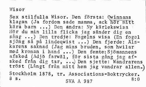 //// Wisor //// Sex stilfulla Wisor. Den första: Qwinnans klagan (Ja fordom sade mamma, ack hör mitt kära barn ...) Den andra: Ny kärlekswisa Hör du min lilla flicka jag sänder dig en sång ...) Den tredje: Fogelns wisa (En fogel sjöng så på lindeqwist .,.) Den fjerde: Älskarens saknad (Jag mins bruden, som hwilar med kronan i hand Den femte:Sjömannens //// afsked (Adjö farwäl, för sista gång jag af-sked från dig tar, ...) Den sjette: Wandrarens tröst (Långt från mitt hem jag vandrar allén..) //// Stockholm 1878, tr. Associations=Boktrycker. //// 3 S. mr« * r\ r> rf 8:0 //// o v i-v y ö / ////