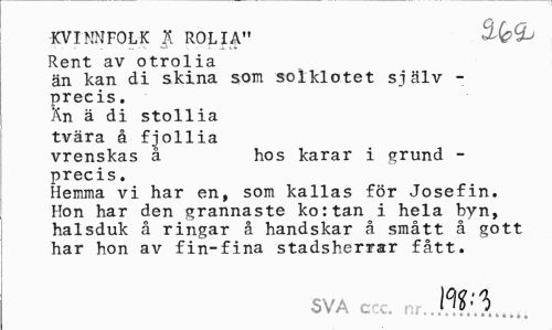 //// KVINNFOLK K ROLIA" Rent av otrolia //// än kan di skina som solklotet själv -precis. //// Xn ä di stollia tvära å fjollia //// vrenskas å hos karar i grund - //// precis. //// Hemma vi har en, som kallas för Josefin. Hon har den grannaste ko:tan i hela byn, halsduk å ringar å handskar å smått å gott har hon av fin-fina stadsherrar fått. //// SVA c:.. . ////