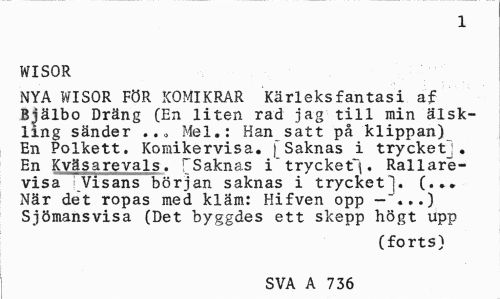//// 1 //// WISOR //// NYA WISOR FÖR KOMIKRAR Kärleksfantasi af Bjälbo Dräng (En liten rad jag till min älskling sänder ... Mel.: Han satt på klippan) En Polkett. Komikervisa. f Saknas i trycket]. En Kväsarevals. FSaknas i" trycket^, Rallarevisa Visans början saknas i trycket]. (... När det ropas med kläm: Hifven opp — "...) Sjömansvisa (Det byggdes ett skepp högt upp //// (forts) //// SVA A 736 ////