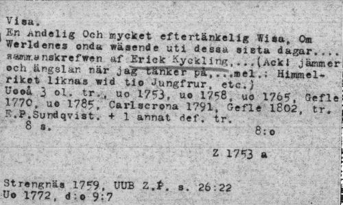//// Visa. //// En Andelig Och mycket ef tertänkelig Wiea, Om Werldenes onda wäaende uti dessa sista dagar... //// awur.önskrefwen af Erick Kyckling,...(Ack! jämmer ech ängslan när jag ¦t&RJTéf H,:'?'.»*! • • Himmelriket liknas wid tio Jungfrur, ete.} Uooå 3 ol. tr.4 uo 1753, ue 1758, uo 1765, Befle 1770, u® 1785, Carlscrona 1791, Gefle 1802, tr. E.P.Sundqvist. + 1 annat def. tr. //// 8 s. 8:o //// Z 1753 a //// Strengnäs 1759, UUB Z.t. s. 26:22 ////