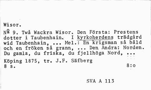 //// Wisor. //// N§ 9, Twå Wackra Wisor. Den Första: Prestens dotter i Taubenhain» I kyrkoherdens trädgård wid Taubenhain, ... Mel.: En krigsman så båld och en fröken så grann, ... Den Andra: Norden. Du gamla, du friska, du fjellhöga Nord, ... //// Köping 1875, tr. J.F. Säfberg 8 s. 8:o //// SVA A 113 ////