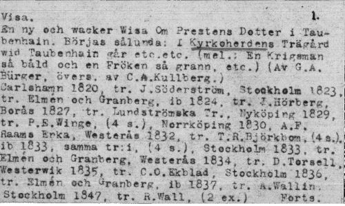 //// Vi sa. //// £n ny och masker Vita Om Prestena Dotter i Taubenhain. Börjas sålunda: L Kyrkoherdens Trägård w id Taub e nha in tår etc.etc, (mel.: Sn Kr i genan så båld och en Fröken aå grann, etc.) (Av G.A, Burger, övers. a/ C.A.Kullberg.) //// Jarlshawn l82ö, tr. J .Söderström, ~tookh®lm 1623, tr. Einar-och Granberg, ib 1824, tr. I.Hörberg, Borås 1827, tr. Lund strö» ska Tr.. Tlyköpirg 1829, tr. P.fi.tfinge, (4 ¦ ;), Norrköping 1830, A.F. ftaams fcrka, Westerås 1832, tr. T. R.BJ örkbom , (4 a.), ib 1833, samma tr:i, [4 s.), Stockholm 1S33, tr, Elmen osh Granberg, Westerås 1834, tr. D.Torseli Westerwik 1835, tr. C.0.Ekblad, Stockholm 1836, tr. Simén och Granberg, ib 1837, tr. ii.Walliri. Stockholm lS47 tr. ft.Wall (2 ex. J Forts. ////