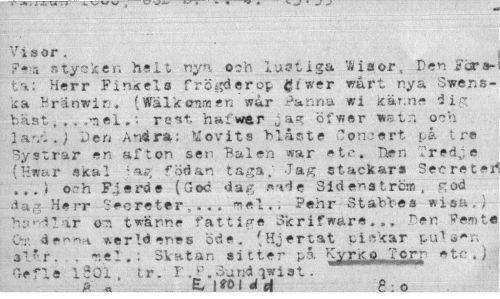 //// Visor . //// ntycken ha It nya och lustiga 'A i a or, Den fåra-ta: Herr Finkels frögderop giwer wårt nya Swenska Bränwin . (Wälkonffien war Panna »i känn- dig bäst, .. .,*nel,: rent, hal'war J ag öfwer wstr» o~h ] avi. ) Den And ra: TJ ovits blåste ?oncert på tre Systrar en afton sen Balen war etc. Tien T red* e (Hwar »Kal födan taga; Jag stackars Secretej //// ,.. i och Fj srde (Goc dag e Sid ena tröm . god dag Herr Secreter,... mel.. Pehr Stabtea wisa,, h? Hl Tar om twärine fattige Skrifwar*..„ Den Femt« C»r. werld enes öde. (Hjertat c i »kar pu1 i»r, //// sl*r. , r.el. : Skatan sitter på Kyrrt o ...Torr etc.) Gefle ISOI, tr. F . P.ound iwiat. ' //// f» ^L-fetr»!^ 8 : o ////