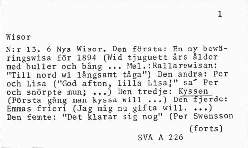 //// 1 //// Wisor //// N:r 13. 6 Nya Wisor. Den första: En ny bewä-ringswisa för 1894 (Wid tjuguett års ålder med buller och bång ... Mel.:Rallarewisan: "Till nord wi långsamt tåga") Den andra: Per och Lisa ("God afton, lilla Lisa,'" sa' Per och snörpte mun; ...) Den tredje: Kyssen (Första gång man kyssa will ...) Den fjerde: Emmas frieri (Jag mig nu gifta will. ...) Den femte: "Det klarar sig nog" (Per Swensson //// (forts) //// SVA A 2 26 ////