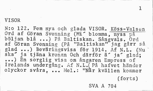 //// 1 //// VISOR //// N:o 12 2, Fem nya och glada VISOR. Köss-Valsen Ord af Göran Svenning (Mi" blomma, nyss på böljan blå ..,) På Ealtiskan. Sångvals. Ord af Göran Svenning (På "Baltiskan" jag gårr så glad ...) Beväringsvisa för 1914. Af N.L. (Nu ska' ja tjäna kronan Och därför ä> ja" glad; ...) En sorglig visa om ångaren Empress of Irelands undergång. Af N.L.^På hafvet händer olyckor svåra, ... Mel.: "När kvällen kommer //// (forts) //// SVA A 2 1 ////