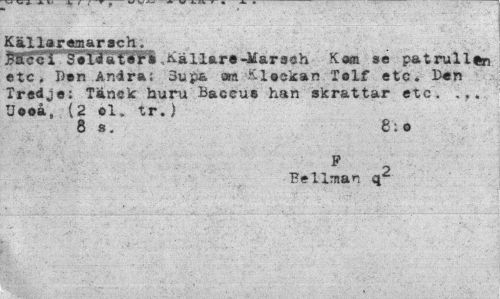 //// Källaremarsch. //// Sacci Sallats*! rvällar»-MarS*h Kam se patrullen etc. Den Andra; Supa ara Kleekan Tolf etc. Den Tredje; Tanek huru Baccus han skrattar etc. Ueeå, (2 ol. tr.) //// 8 8. 8: o //// F 2 Bellman q* ////
