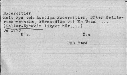 //// Excercitier //// Helt Nya och Lustiga Excercitier, Efter Melita-risk methode, Förestälde Uti En Wisa, (Kallar-Nycke1n ligger här,,..) uo r/vo //// 8 s. 8:0 //// UUB Bond ////
