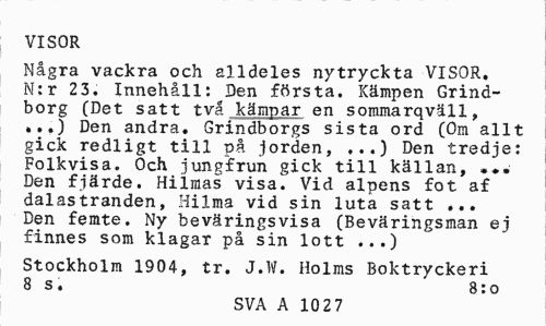 //// VISOR //// Några vackra och alldeles nytryckta VISOR. N;r 2 3. Innehåll: Den första. Kämpen Grindborg (Det satt två kämpar en sommarqväll, //// Den andra. Grindborgs sista ord (Om allt gick redligt till på jorden, Den tredje: //// Folkvisa. Och jungfrun gick till källan, • •• Den fjärde. Hilmas visa. Vid alpens fot af dalastranden, Hilma vid sin luta satt ... Den femte. Ny beväringsvisa (Beväringsman ej finnes som klagar på sin lott ...) //// Stockholm 1904, tr. J.W. Holms Boktryckeri 8 s. 8:o //// SVA A 1027 ////