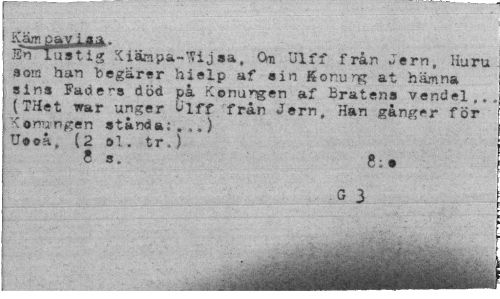 //// Kämoay La a. //// En lustig Xiärapa-Wijsa, öu Ulff från Jern, Huru som han begarer hielp af sin Korurg at hämna sins Faders död på Konungen af Bråtens vendel,. (THet war unger «lff från Jern, Han gånger för Konungen standa:...) Ueoå, (2 ol. tr.) //// 8 s . 8; • //// ¦G 3 //// 'iniiifiTiiiÉfeflliriiiiil n ////