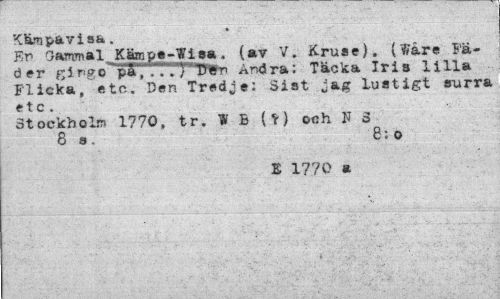 //// K&npåvisa. //// Er Gammal Kämpe-Wisa. (av V. Kruae). (Wåre Fäder gingo paTTTTrWr. Andra: Täcka Iris lilla Flicka, etc. Den Tredje: Sist jag lustigt surra etc . //// Stockholm 1770, tr. W B (\) och N S //// 8 s. 8:o //// E 1770 a ////