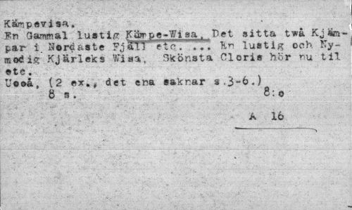 //// Kärnpevisa. //// En Gammal lustig ffjjffpe-7/iaat Det sitta twå Kj«m~ par i. Nerdaste Fjäll et c. ... En lustig och ITy-modig Kjärleks Visa, Gkönsta Cloris hör nu til ete. //// Uooå, (2 ex., det ena saknar $.3-6.) //// 6 a. 8:o //// A 16 ////