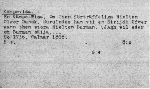 //// Kä^pev i aa. //// ~f.n Kämpe-Wiaa, Om Then förträffeliga Hielten Olger Danalc, Huruledes han v ti en Strijdh öfwer wann then stora Hielten Burman. tJAgh wil eder om Burman sälja,... Uo 1736, Calmar 1808. //// 8 3. . 8;o //// G 4 ////