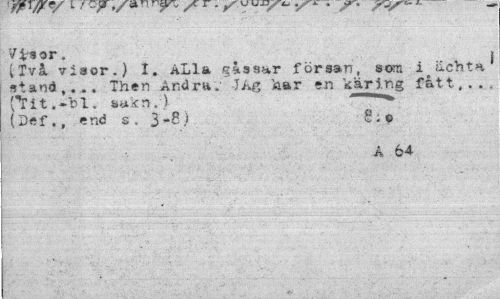 //// fisor. //// [Två visor.) I. ALla gåssnr försan, som i ächta1 etand,... Then Andra. -JAg ii ar en käring fatt,... //// (Trit.-fcl. sakn.) — //// (Def., end s. 3-8) 8.0 //// A 64 ////