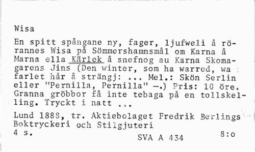 //// Wisa //// En spitt spångane ny, fager, ljufweli å rörannes Wisa på Sömmersharansmål om Karna å Marna ella Kärlek å snefnog au Karna Skoma-garens Jins (Den winter, som ha warred, v/a : farlet 3iår å strängj: ... Mel,: Skön Serlin eller "Pernilla, Pernilla" Pris: 10 öre. Granna gröbbor få inte tebaga på en tollskel-ling. Tryckt i natt //// Lund 1888, tr. Aktiebolaget Fredrik Berlings Boktryckeri och Stilgjuteri //// 4 s* SVA A 434 8:0 ////