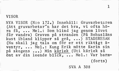//// 1 //// VISOR //// NYA VISOR (N:o 172.) Innehåll: Gruvarbetaren (Att gruvarbetaren har det bra, vi ofta höra få, ... Mel.: Som blind jag genom livet får vandra) Graven på stranden (På Bohusläns kust ibland klippor så grå, ...) STADSRESAN (Nu skall jag tala om för er ett riktigt ä-ventyr, ... Mel.: Kung Erik mötte Karin sin på skogens ...) Min kärlek (Uti kärlek så ömt av din leende blick, ... Mel.: Var barm- //// (forts) //// SVA A 308 ////