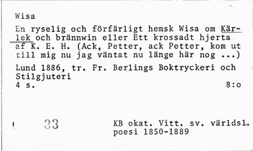 //// Wisa //// En ryselig och förfärligt hemsk Wisa om Kär-lek och brännwin eller Ett krossadt hjerta af K. E. H. (Ack, Petter, ack Petter, kom ut till mig nu jag väntat nu länge här nog ...) //// Lund 1886, tr. Fr. Berlings Boktryckeri och Stilgjuteri //// 4 s. 8:0 //// j KB okat. Vitt. sv. världs 1« //// poesi 1850-1889 ////