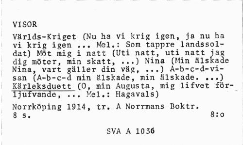//// VISOR //// Världs-Kriget (Nu ha vi krig igen, ja nu ha vi krig igen ... Mel.: Som tappre landssoldat) Möt mig i natt (Uti natt, uti natt jag dig möter, min skatt, ...) Nina (Min älskade Nina, vart gäller din väg, ...) A-b-c-d-vi-san (A-b-c-d min älskade, min älskade. ...) Kärleksduett (0, min Augusta, mig lifvet för-ljufvande, ... Mel.: Hagavals) //// Norrköping 1914, tr. A Norrmans Boktr. 8 s. 8: o //// SVA A 10 36 ////