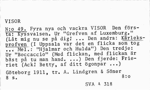 //// VISOR //// N:o 49. Fyra nya och vackra VISOR Den förs-ta: Kyssvalsen. Ur "Grefven a£ Luxemburg." (Låt mig nu se på dig.' ... Den andra: Kärleks-profven (I Uppsala var det en flicka som tog ... Mel.: "Hjalmar och Hulda") Den tredje: Ur "Boccaccio" (Med flickan, med flickan är bäst på tu man hand. ...) Den fjerde: Frieriet (Ack! Betty, af ditt ögonpar ...) //// Göteborg 1911, tr. A. Lindgren å Söner 8 s. 8:o //// SVA ^ 318 ////