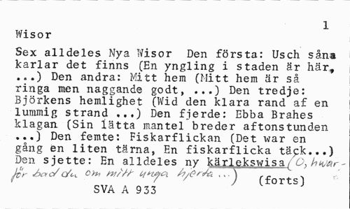 //// 1 //// Wisor //// Sex alldeles Nya Wisor Den första: Usch såna karlar det finns (En yngling i staden är här, ...) Den andra: Mitt hem (Mitt hem är så ringa men naggande godt, ...) Den tredje: Björkens hemlighet (Wid den klara rand af en lummig strand ...) Den fjerde: Ebba Brahes klagan (Sin lätta mantel breder aftonstunden ...) Den femte: Fiskarflickan (Det war en gång en liten tärna, En fiskarflicka täpk...) Den sjette: En alldeles ny kärlekswisa (O, b war-jtr o/c/k. oh, w/M ynyxPi /yO^ .. J(fOrt«0 SVA A 9 33 ////
