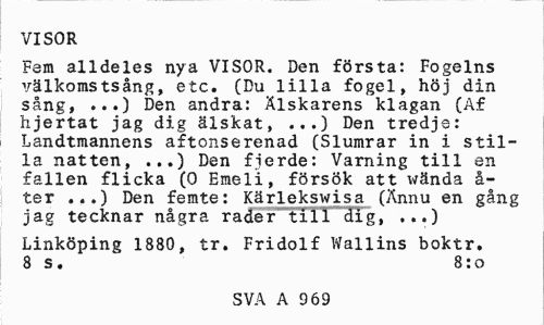 //// VISOR //// Fem alldeles nya VISOR. Den första: Fogelns välkomstsång, etc. (Du lilla fogel, höj din sång, ...) Den andra: Älskarens klagan (Af hjertat jag dig älskat, ...) Den tredje: Landtmannens aftonserenad (Slumrar in i stilla natten, ...) Den fierde: Varning till en fallen flicka (0 Emeli, försök att wända å-ter ...) Den femte: Kärlekswisa (Ännu en gång jag tecknar några rader"till dig, ...) //// Linköping 1880, tr. Fridolf Wallins boktr. 8 s. 8:o //// SVA A 969 ////