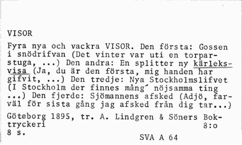 //// VISOR //// Fyra nya och vackra VISOR. Den första: Gossen i snödrifvan (Det vinter var uti en torparstuga, ...) Den andra: En splitter ny kärleks-visa (Ja. du är den första, mig handen har gifvit, ...) Den tredje: Nya Stockholmslifvet (I Stockholm der finnes mång' nöjsamma ting ...) Den fjerde: Sjömannens afsked (Adjö, farväl för sista gång jag afsked från dig tar...) //// Göteborg 1895, tr. A. Lindgren & Söners Boktryckeri 8:0 //// 8 S* SVA A 64 ////