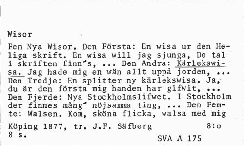 //// Wisor //// Fem Nya Wisor. Den Första: En wisa ur den Heliga skrift. En wisa will jag sjunga, De tal i skriften finnas, ... Den Andra: Kärlekswisa, Jag hade mig en wän allt uppå jorden, ... Den Tredje: En splitter ny kärlekswisa. Ja, du är den första mig handen har gifwit, ... Den Fjerde: Nya Stockholmslifwet. I Stockholm der finnes mång" nöjsamma ting, ... Den Femte: Walsen. Kom, sköna flicka, walsa med mig //// Köping 1877, tr. J.F. Säfberg 8:0 //// 8 s* SVA A 175 ////