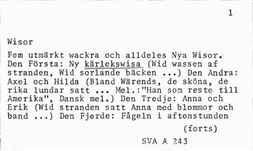 //// 1 //// Wisor //// Fem utmärkt wackra och alldeles Nya Wisor. Den Första: Ny kärlekswisa (Wid wassen af stranden, Wid sorlande bäcken ...) Den Andra: Axel och Hilda (Bland Wärends, de sköna, de rika lundar satt ... Mel.:"Han som reste till Amerika", Dansk mel.) Den Tredje: Anna och Erik (Wid stranden satt Anna med blommor och band ...) Den Fjerde: Fågeln i aftonstunden //// (forts) //// SVA A 2 24 ////