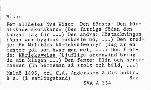 //// Wisor //// Fem alldeles Nya Wisor Den första: Den förälskade skomakaren (Den fattiga födan den knogar jag för ...) Den andra: Hös täckningen (Anna war bygdens raskaste mö, ...) Den tredje: En Militärs kärleksäfwentyr (Jag är en munter gök som hwar man wet, ...) Den fjerde: Kärleks=wisa (Ljufliga aftonwind bring du min klagan ...) Den femte: Elin och herremannen (En herreman så stolt och båld, ...) //// Malmö 1895, tr. C.A. Andersson & C:s boktr. 8 s. (i samlingsband) 8:0 //// SVA A 254 ////