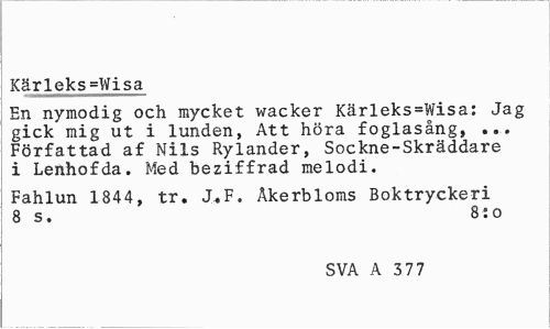//// Kärleks=Wisa //// En nymodig och mycket wacker Kärleks=Wisa: Jag gick mig ut i lunden, Att höra foglasång, ... Författad af Nils Rylander, Sockne-Skräddare i Lenhofda. Med beziffrad melodi. //// Fahlun 1844, tr. J,F. Åkerbloms Boktryckeri 8 s. 8:0 //// SVA A 3 77 ////