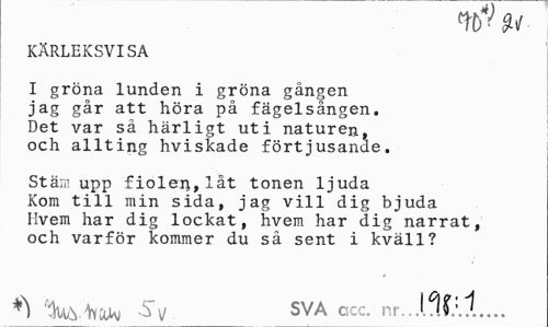 //// w //// KÄRLEKSVISA //// I gröna lunden i gröna gången jag går att höra på fågelsången. Det var så härligt uti naturen, och allting hviskade förtjusande. //// Stäm upp fiolen,låt tonen ljuda Kom till min sida, jag vill dig bjuda Mvem har dig lockat, hvem har dig narrat, och varför kommer du så sent i kväll? //// Vs.to SVA gcc. nrJ.flf-.l... ////