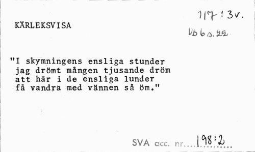 //// KÄRLEKSVISA, E" SORGLIG //// Vbleb.iLl //// "I skymningens ensliga stunder jag drömt mången tjusande dröm att här i de ensliga lunder få vandra med vännen så öm." //// SVA acc. nr.W'1 ////