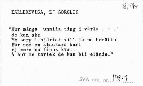 //// KÄRLEKSVISA, E" SORGLIG //// "Hur många unnlia ting i värla de kan ske //// Me sorg i hjärtat vill ja nu berätta Hur som en stackars karl ej mera nu finns kvar Å hur me kärlek de kan bli elände." //// SVA acc. nr.W'1 ////