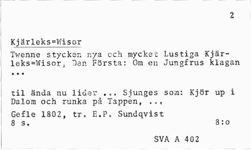 //// 2 //// K j är1eks=Wisor //// Tv/enne stycken nya och mycket Lustiga Kjär- //// leks=Wisor3 Den Första: Om en Jungfrus klagan • • • //// til ända nu lider . „. Sjunges som: Kjör up i Dalom och runka på Tappen, .,, //// Gefle 1802, tr. E.PS Sundqvist 8 s. 8 : o //// SVA A 402 ////